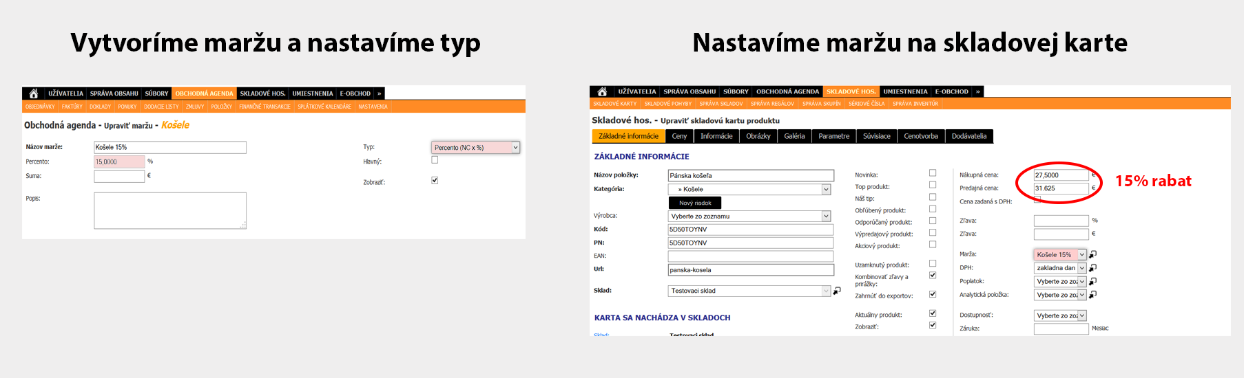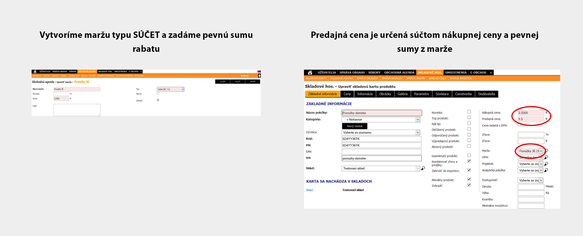 Predajca má za určitý druh tovaru konštantnú predajnú cenu, ktorá nie je závislá od nákupnej ceny alebo kvantity (váhy) produktu. Pri vytváraní produktu alebo pri jeho príjme stačí, ak mu priradí maržu určenú pre tento druh produktu a predajná cena sa automaticky vyráta. Typ marže SUMA (€ * Q), pričom kvantita na skladovej karte je nastavená na 0 alebo 1.