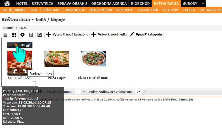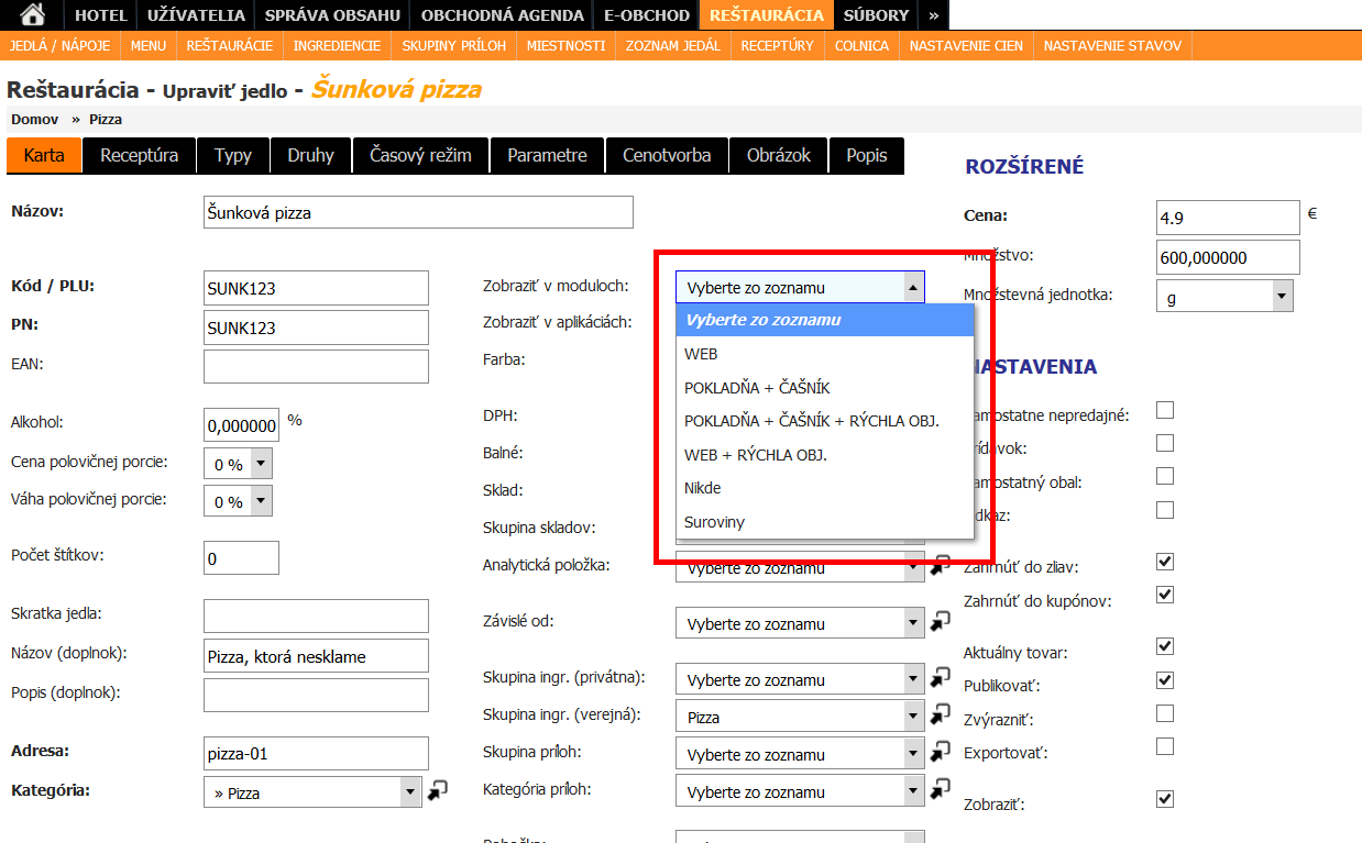 Jedlá a nápoje v reštauračných zariadeniach môžu byť zobrazované alebo predávané v rôznych moduloch informačného systému. Ak je súčasťou reštauračného zariadenia klasická reštaurácia s čašníkmi a zároveň aj donášková služba, tak je niekedy potrebné určiť, ktoré jedla sa majú kde zobrazovať prípadne nezobrazovať. Keďže systém je rozdelený podľa funkčnosti na rôzne moduly, umožňuje priamo na položke nastaviť jeho zobrazenie v týchto moduloch.