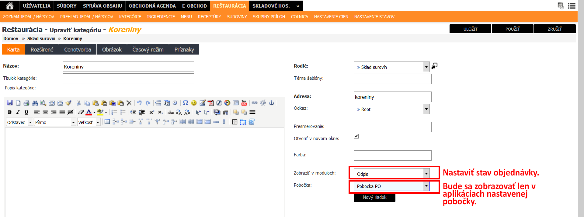 ak sa má kategória Odpis zobrazovať len v aplikáciach na konkrétnej pobočke, tak do poľa Pobočka nastavíme danú pobočku, ak pole necháme v stave Vyberte zo zoznamu, tak sa kategória zobrazí vo všetkých pobočkách