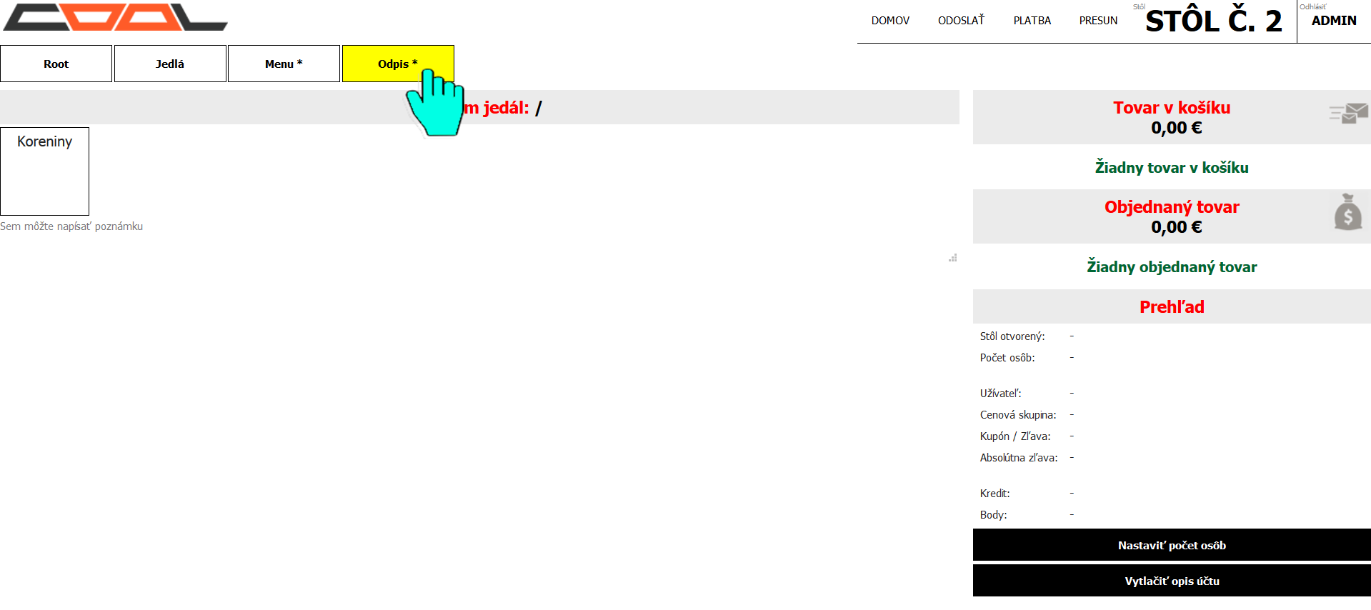 V aplikáciach, ako sú POKLADŇA a ČAŠNÍK, je možné zobraziť špeciálnu kategóriu Odpis*. V tejto kategórii sa zobrazia všetky kategórie, ktoré majú nastavený atribút Suroviny v poli Zobraziť v moduloch v nastaveniach kategórie.