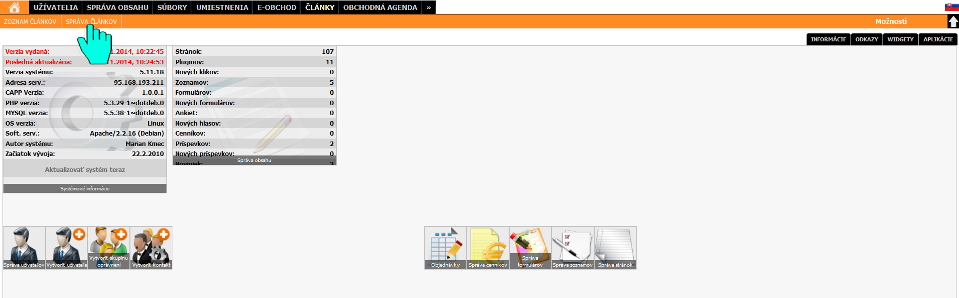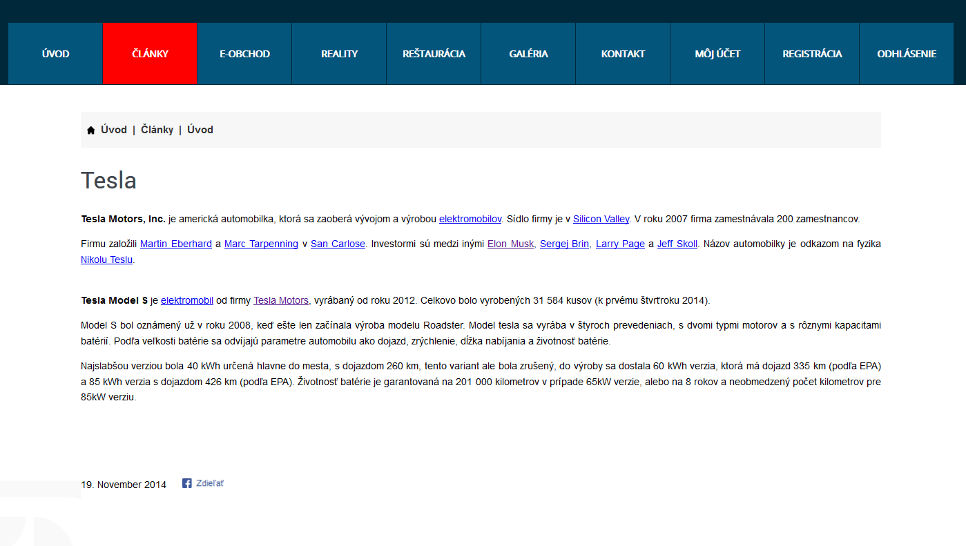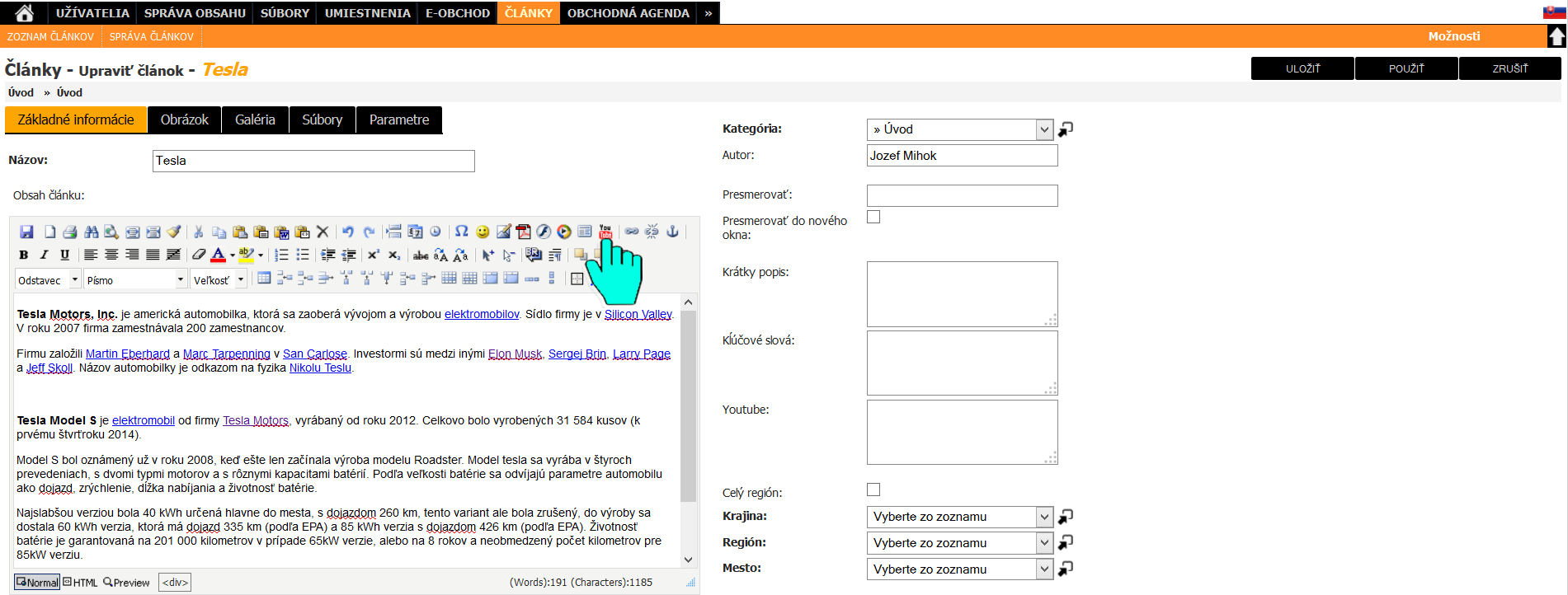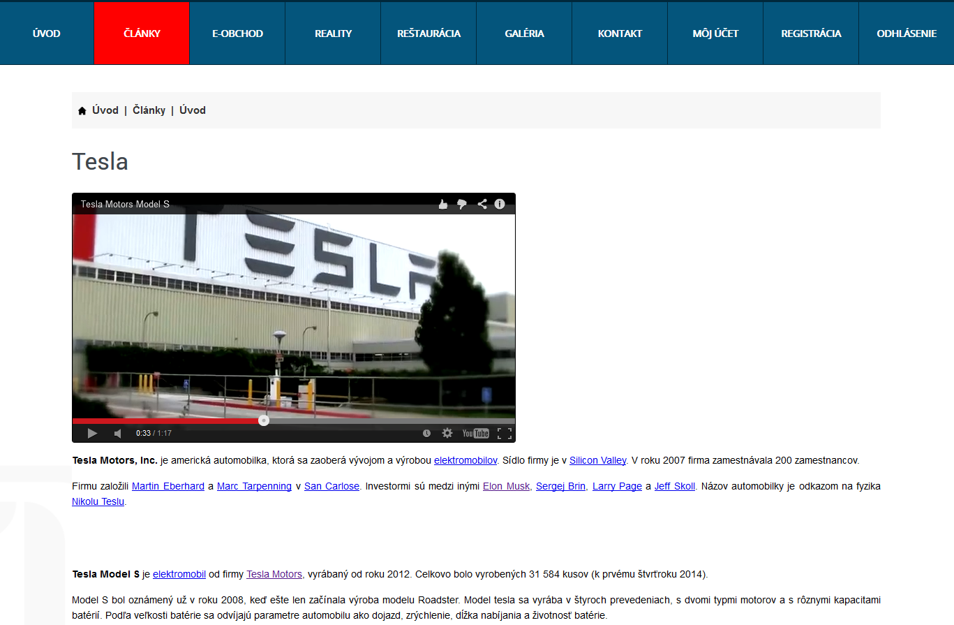Do článkov zobrazovaných vo verejnej časti je možné okrem obrázkov vkladať pomocou textového editora aj videa z portálu www.youtube.com.