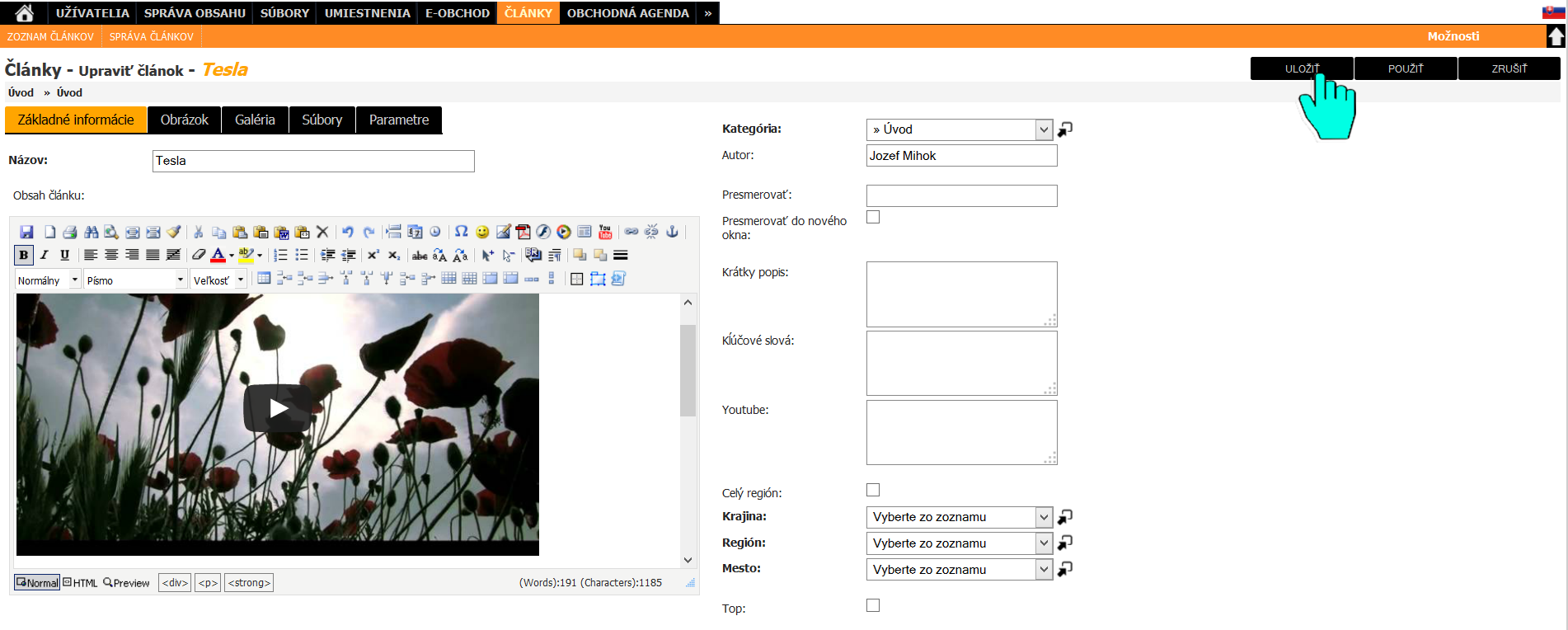 Na mieste kurzora sa objaví video. Uložíme zmeny a prejdeme do verejnej časti na konkrétny článok.