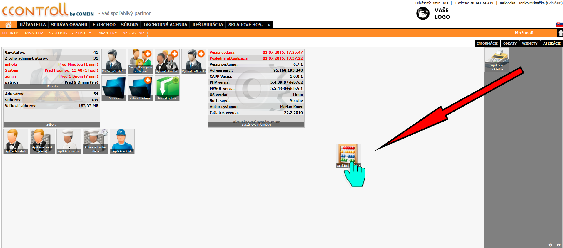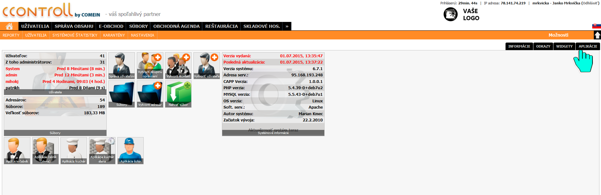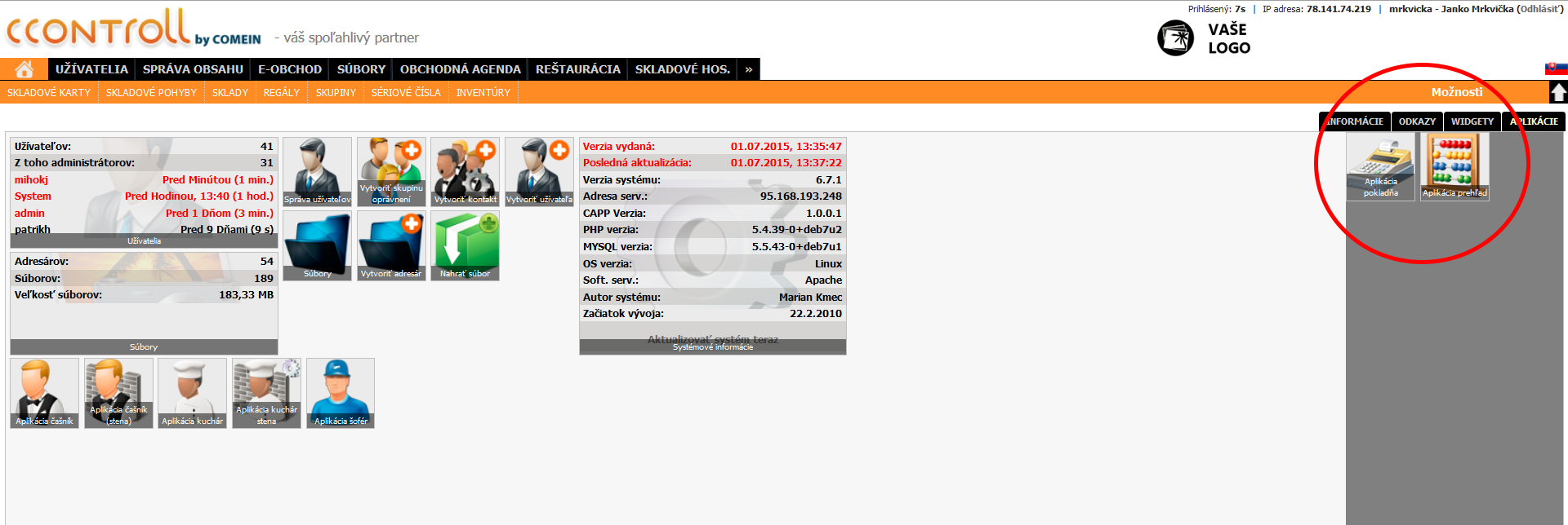 Aplikácie sú prezentované odkazmi vo forme ikoniek. Patria tu napríklad aplikácie pre správu reštaurácií, pokladní atď.
