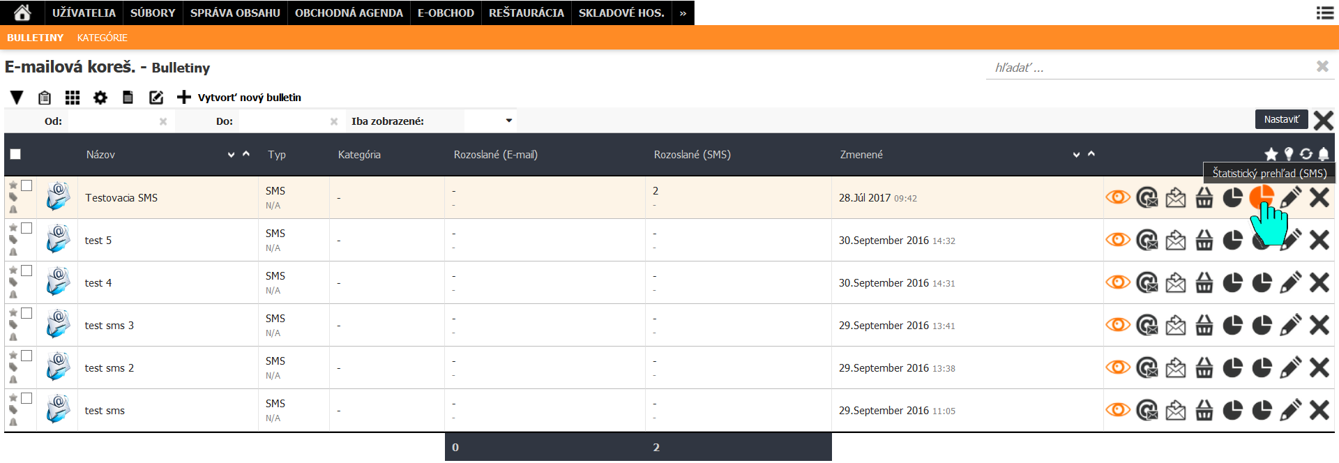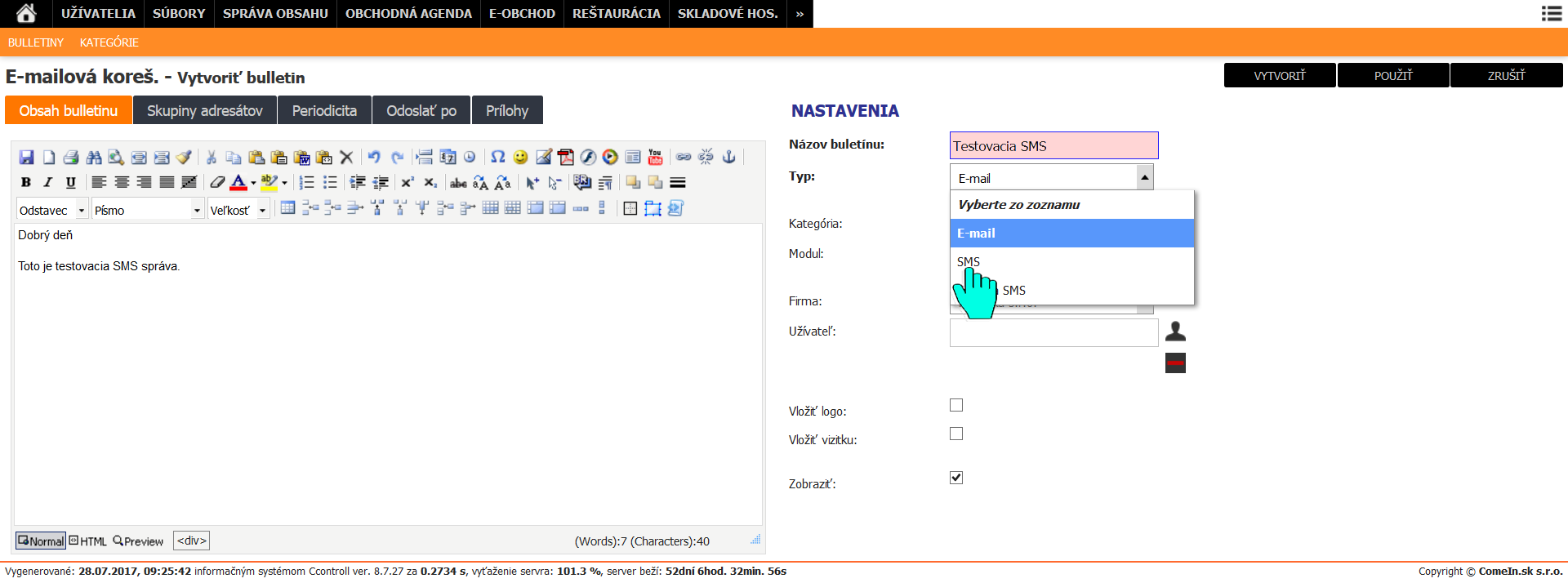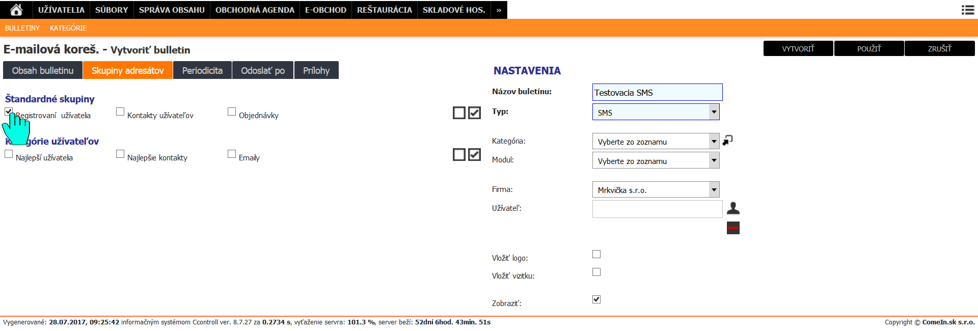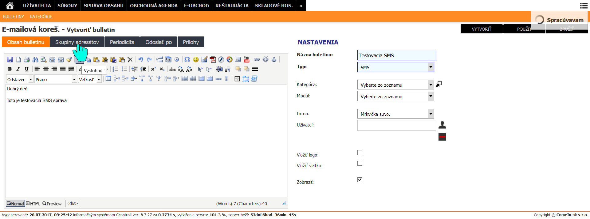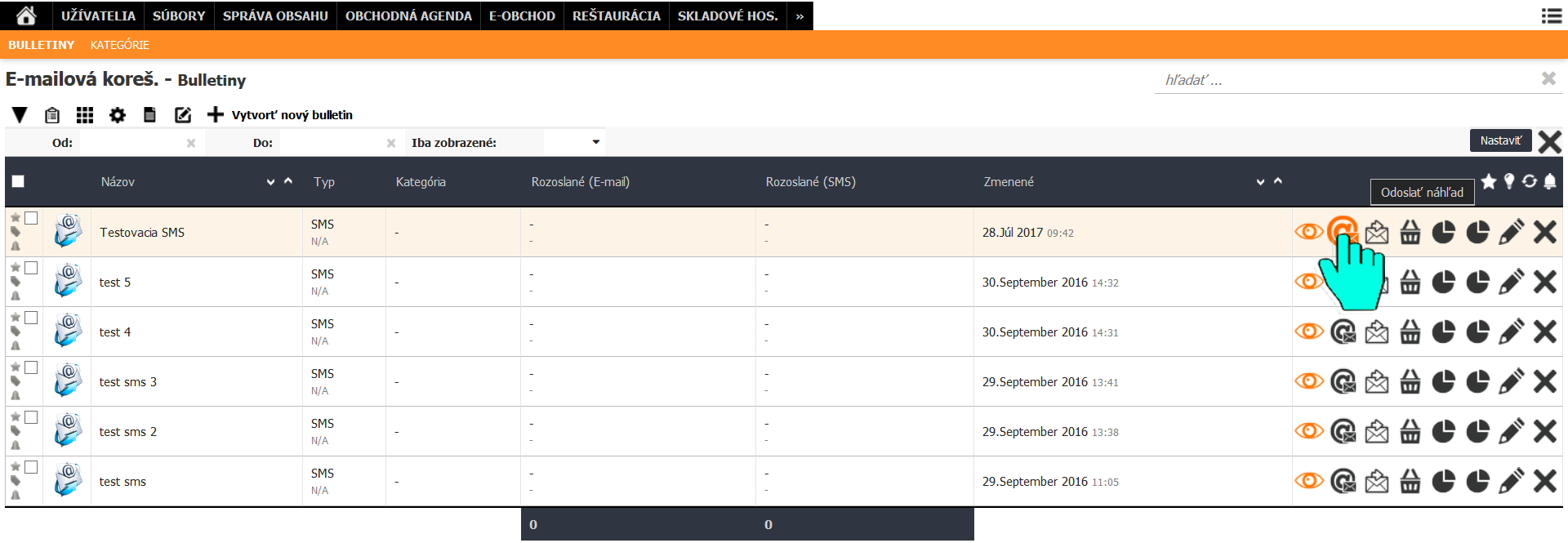 Automaticky sa zobrazí možnosť zaslať SMS na užívateľa, ktorý je aktuálne prihlásený, prípadne je možné napísať tel. číslo, na ktoré sa má zaslať náhľad SMS. Pre správne odoslanie sms je potrebné, aby mal užívateľ nastavené telefónne číslo vo svojom profile. Odosielanie náhľadu nie je potrebné pre hromadné odosielanie SMS, slúži len na kontrolu.
