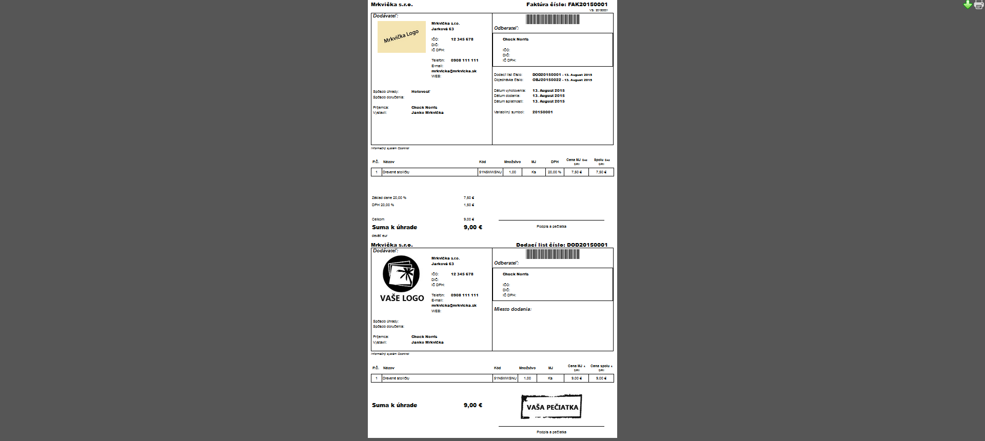 V náhľade sa zobrazí faktúra s dodacím listom, ak bol list vygenerovaný z objednávky, z ktorej bola vytvorená faktúra. Dokumenty môžeme vytlačiť kliknutím na ikonku tlačiarne v pravom hornom rohu obrazovky.