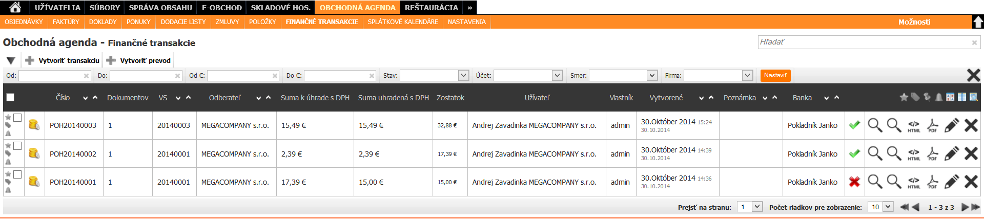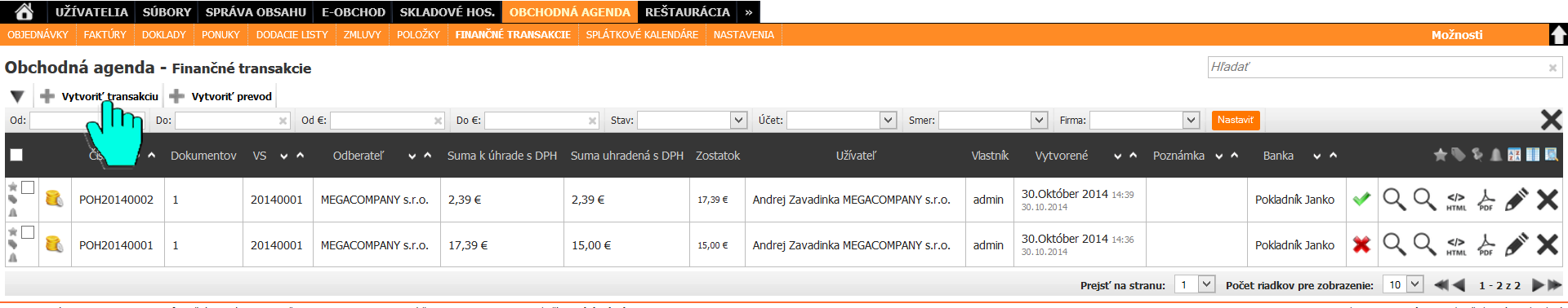Zobrazí sa nám zoznam všetkých vytvorených transakcii v systéme.