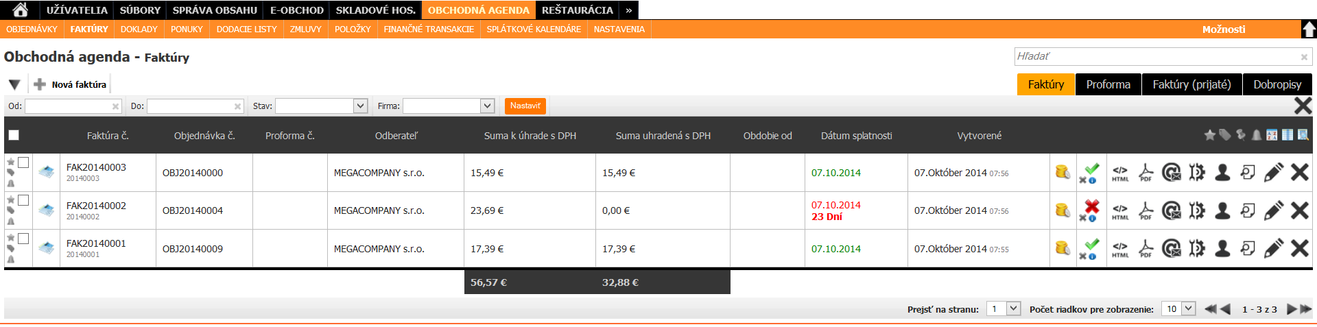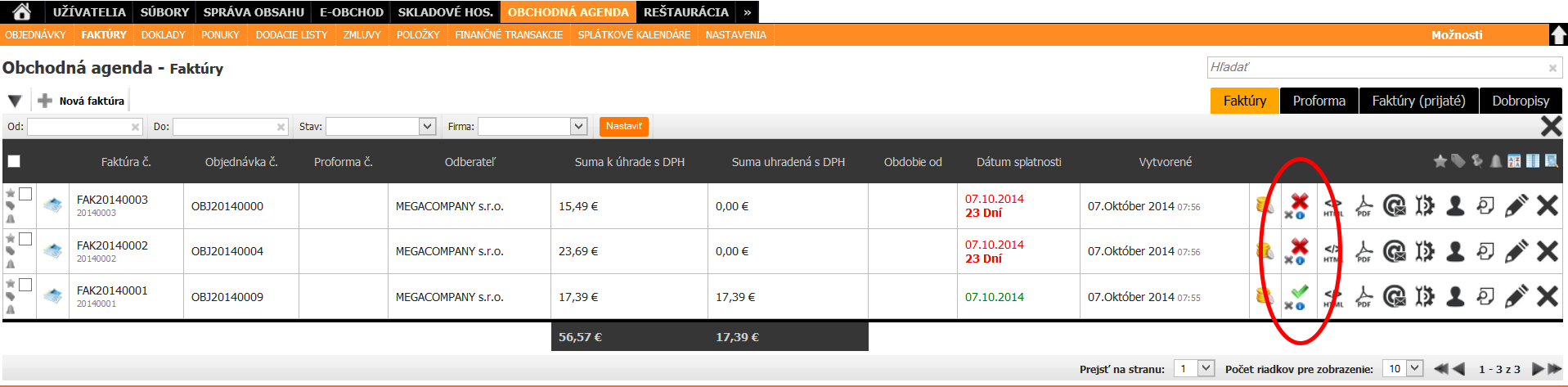 V module OBCHODNÁ AGENDA, v podmodule FAKTÚRY sa pri príslušnej faktúre zmení ikona úhrady, avšak len v tom prípade, ak suma priradenej finančnej transakcie je minimálne taká vysoká, ako je fakturovaná suma.