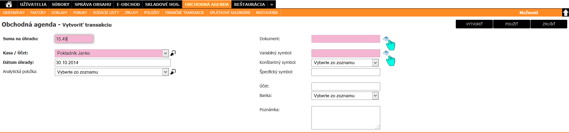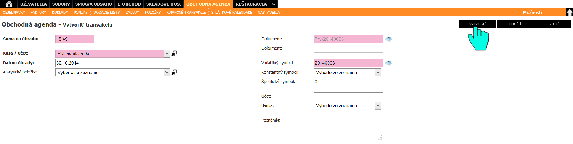 V module OBCHODNÁ AGENDA vyberieme podmodul FINANČNE TRANSAKCIE.