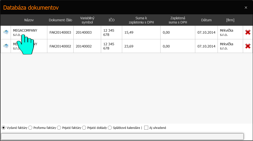 Vyplníme zvýraznené údaje a klikneme na ikonu vedľa poľa Dokument alebo Variabilný symbol