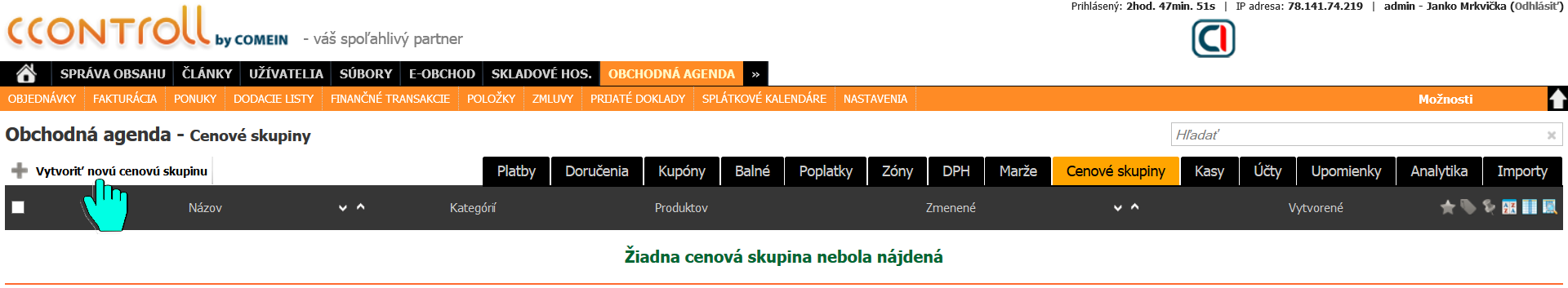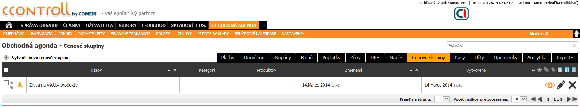 Po vytvorení skupiny sa nám zobrazí zoznam všetkých cenových skupín.
