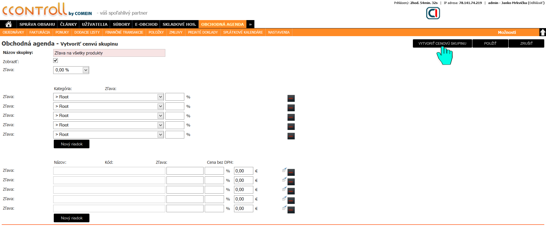 Je potrebné vyplniť názov cenovej skupiny a poprípade konkrétny typ zľavy, ktorú chceme skupine nastaviť. Cenovú skupinu vytvoríme kliknutím na