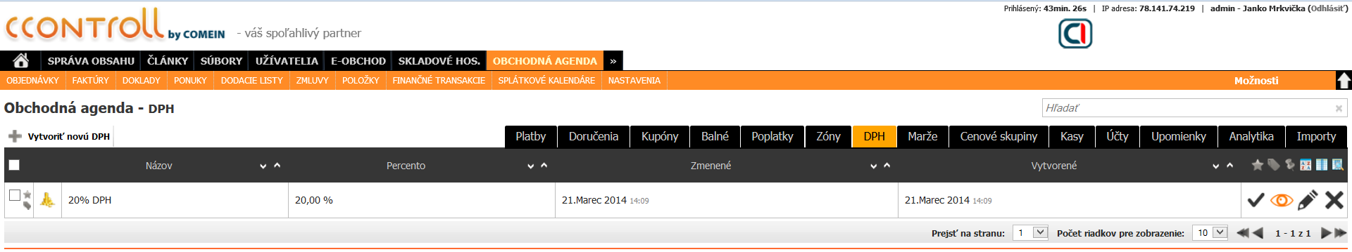 Po vytvorení sadzby sa nám zobrazí zoznam všetkých sadzieb.
