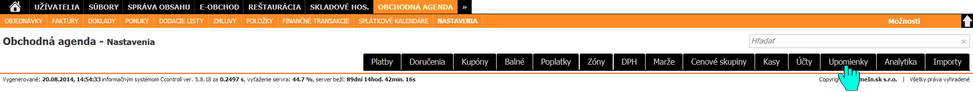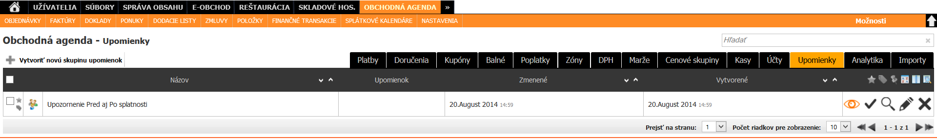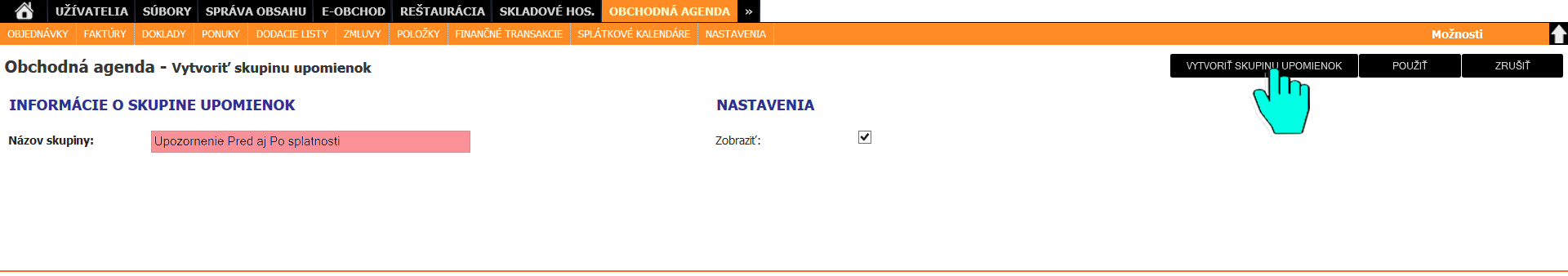 Skupina upomienok slúži na ukladanie rôznych typov upomienok. Ak chceme, aby bol príjemca faktúry informovaný, že sa blíži deň splatnosti, alebo že faktúra už je po dátume splatnosti, vytvoríme jednotlivé upomienky, zaradíme ich do skupiny upomienok a priradíme skupinu k faktúre.
