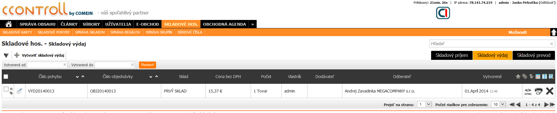 Vytvorenú skladovú výdajku si môžeme skontrolovať v module