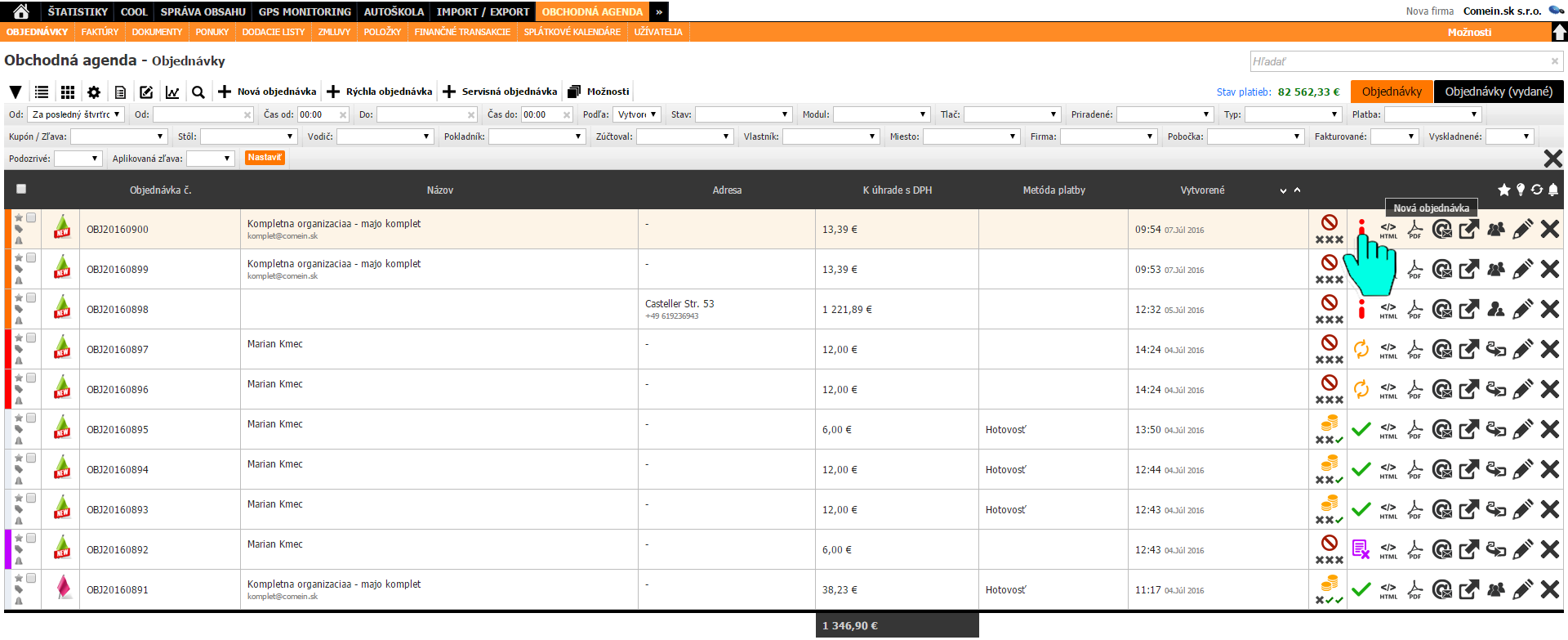 V podmodule Objednávky, vidíme všetky objednávky, ktoré sme vytvorili. Hneď na prvej objednávke vpravo si klikneme na symbol, v našom prípade je to červené i. Tento symbol nás informuje, že sa jedná o Novú objednávku.