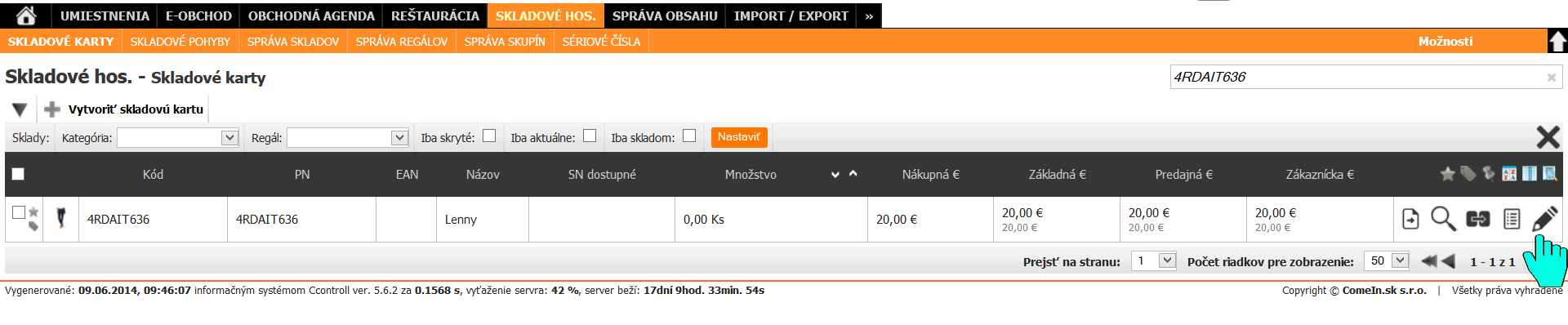 Vyhľadáme skladovú kartu produktu, ktorému chceme nastaviť váhu.
