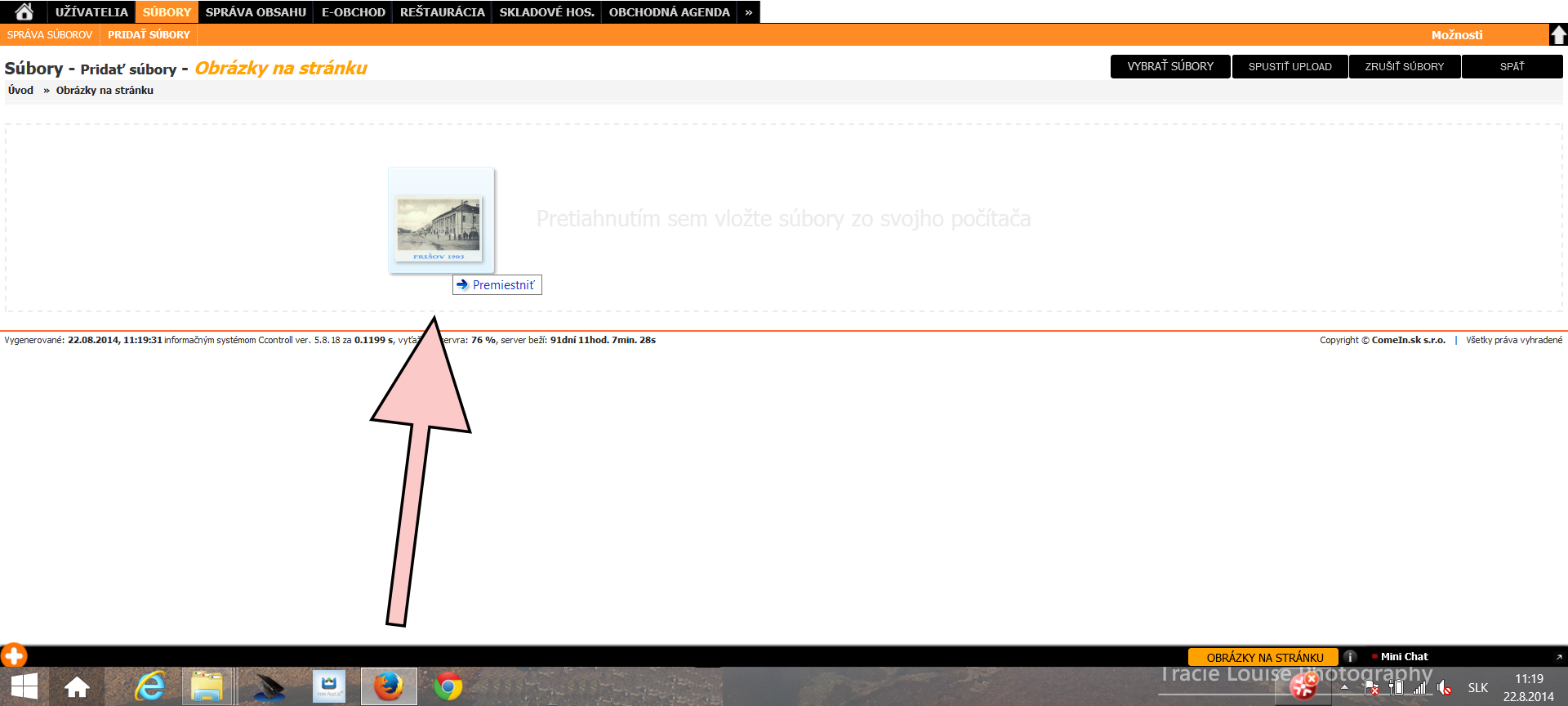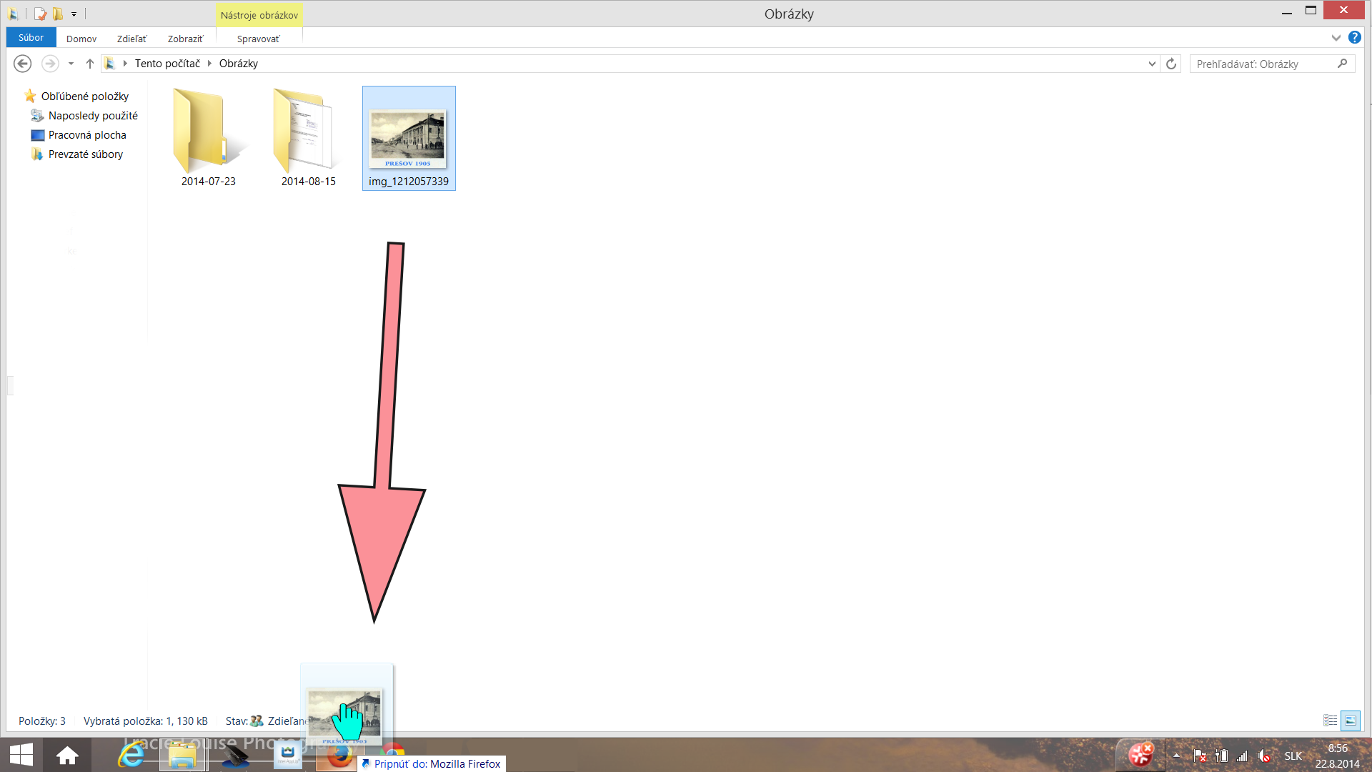 Vyhľadáme v počítači obrázok/y, ktorý chceme nahrať do systému. Chytíme ho kurzorom myši a presunieme ho nad ikonu prehliadača, v ktorom máme otvorený systém. Otvorí sa okno prehliadača.