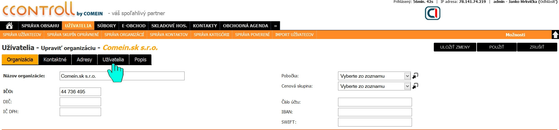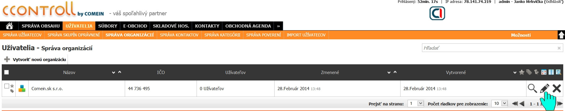 Klikneme na ikonu ceruzky napravo v menu organizácie, do ktorej chceme pridať užívateľa.