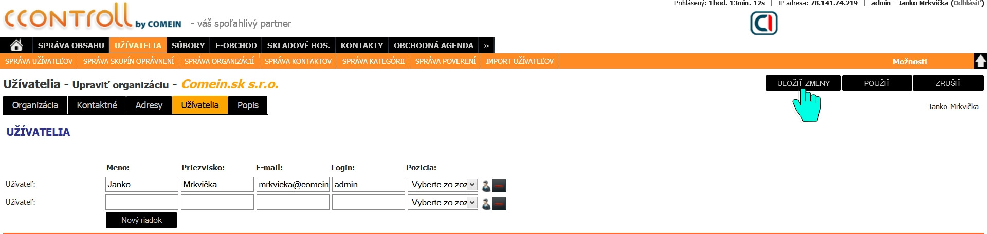 Pridať užívateľa do organizácie.